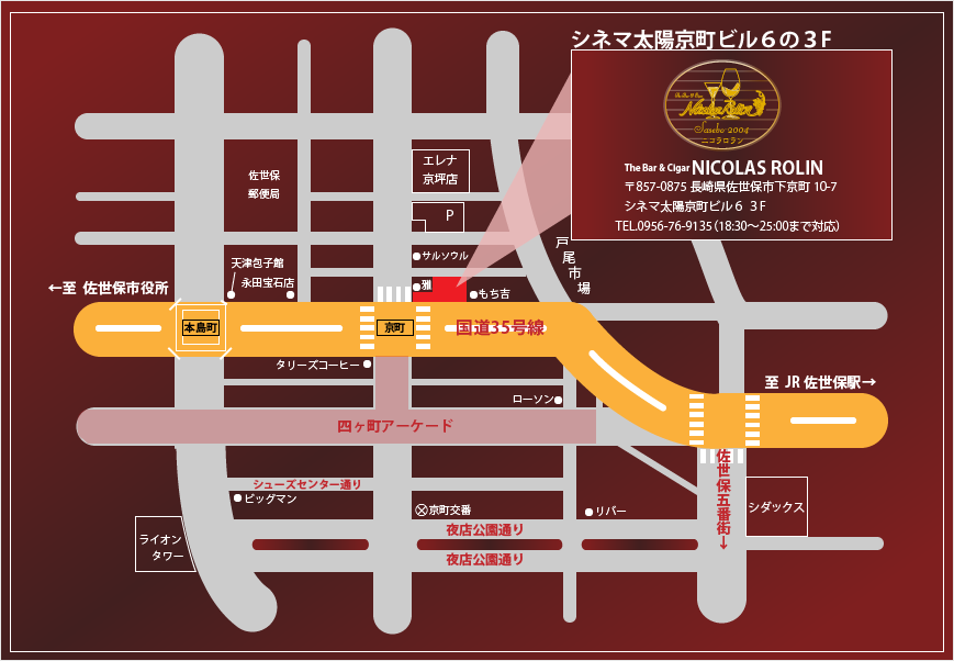 | アクセス | JR佐世保線 佐世保駅から国道35号線を佐世保市役所方面に徒歩7分。 最寄バス停 佐世保市営バス 京町バス停下車。 |